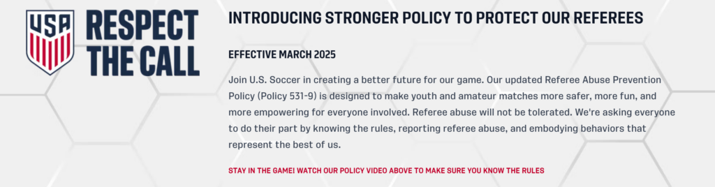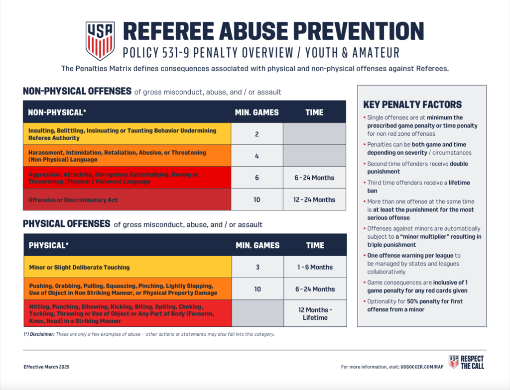 United States Youth Futsal and U.S. Soccer are standing firm to protect referees and restore respect to the game. The updated policy includes stronger sanctions for any form of physical or non-physical abuse towards referees. We encourage every player and coach to learn what behaviors cross the line, so they can avoid penalties and help create a better culture for the future of soccer.